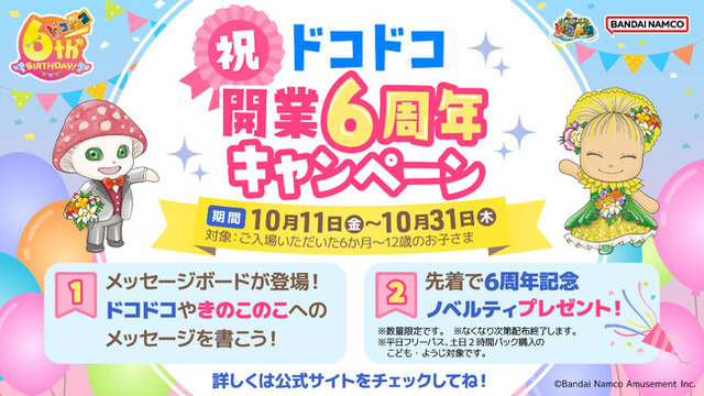 株式会社バンダイナムコアミューズメントが運営する『屋内・冒険の島 ドコドコ』(東京都立川市)が2024年10月に6周年を迎えることを記念して、10月11日(金)~10月31日(木)の間『祝!ドコドコ開業6周年キャンペーン』を開催します。