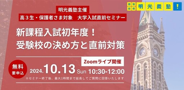 個別指導の「明光義塾」を全国展開する株式会社明光ネットワークジャパン(本社:東京都新宿区、代表取締役社長:山下 一仁)は、新課程入試最初の受験生となる高3生とその保護者を対象に、最終的な受験校の決め方と直前期の勉強法についての情報を提供するオンラインセミナーを開催いたします。