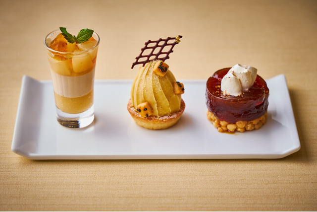 洋梨ゼリーと紅茶のババロアにフレッシュな洋梨と柿を合わせた“洋梨と柿のヴェリーヌ”、タルト生地の上に黒糖のババロアをのせ“とみつ金時”を使用した、なめらかな舌触りと甘みのクリームをまとった“とみつ金時のモンブラン”、オーブンでじっくりキャラメリゼしたりんごを米粉のアーモンドクランブルの上に重ね、生クリームとシナモンの香り付けをした “りんごのタルトタタン”の3種のデザートを、コーヒーまたは紅茶とともにご堪能ください。