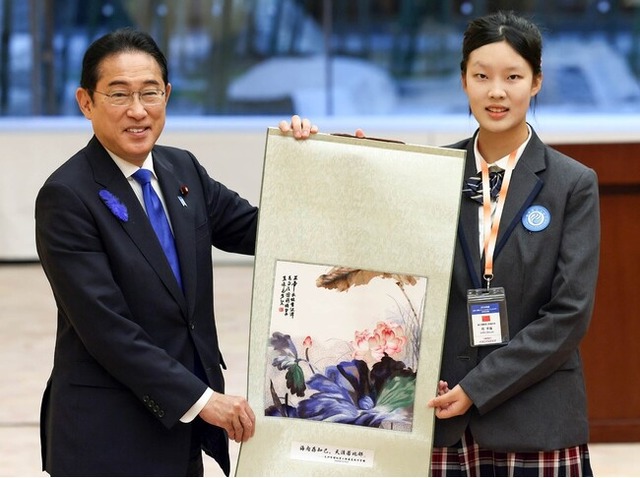 2024年度 日本 中国 ティーンエイジアンバサダー 日本プログラムにて中国高校生代表者による岸田首相への記念品贈呈