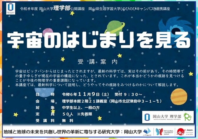 国立大学法人岡山大学(本部:岡山市北区、学長:那須保友)の理学部では、2024年11月9日(土)に公開講座「宇宙のはじまりを知る」を理学部が所在する本学津島キャンパスで開催します。