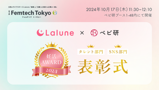 本展示会の注目イベントとして、「女性の生理日・排卵日などの周期管理を通じて、体調管理を幅広くサポートするアプリ、ラルーン」(株式会社メドレー 本社:東京都港区)との共同主催にて、「ラルーン×べビ研 妊活アワード2024」の表彰式を10月17日(木)11時30分より開催いたします。