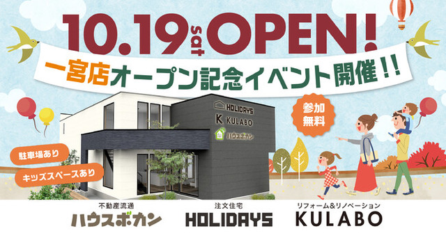 不動産仲介部門の「ハウスボカン」、注文住宅部門の「HOLIDAYS」、リノベーション部門の「KULABO」が併設していますので、住まいに関するご相談をトータルにサポートできます。