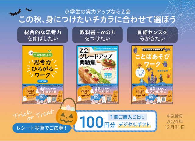 株式会社増進会ホールディングス(Z会グループ)のグループ会社、株式会社Z会ソリューションズは、対象書店にて、Z会の小学生向け書籍を購入すると、1冊ごとに100円分のデジタルギフトをプレゼントするキャンペーンを、2024年9月30日~12月31日まで、実施いたします。Z会は、小学生のおうち学習を応援しています!