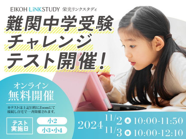 株式会社増進会ホールディングス(Z会グループ)のグループ会社、株式会社栄光(本社:東京都千代田区 代表取締役社長:下田勝昭)が運営するオンライン進学塾「EIKOH LiNKSTUDY(栄光リンクスタディ)」は、難関中学進学を目指す小学2・3・4年生と保護者を対象に「難関中学受験チャレンジテスト」を2024年11月2日(土)、3日(日)に開催します。