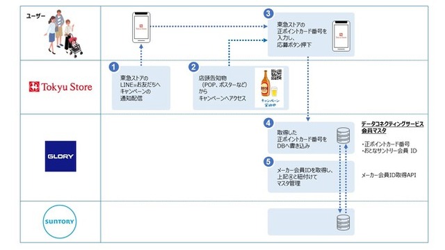 グローリーは、サントリー株式会社(代表取締役社長:鳥井 信宏)と株式会社東急ストア(代表取締役社長:大堀 左千夫)をデータコネクティングサービスのファーストユーザーとして、10月3日よりサービスを開始いたします。