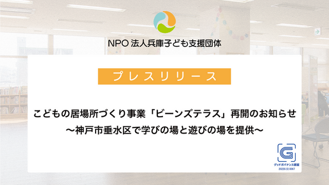 認定NPO法人兵庫子ども支援団体(所在地:兵庫県明石市、代表理事:多田実乘、以下「当法人」という)は、2024年5月より休止していたこども居場所づくり事業「ビーンズテラス」を2024年10月12日より再開いたします。地域の子どもたちに学習や遊びの場を提供することで、ミッションである「子どもが笑って過ごせる地域の形成」を目指して参ります。