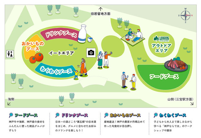 イートスペースで食べるもよし、東遊園地の芝生にシートを広げて食べるもよし!公園を一望できる見晴らし広場には、アウトドアブランド「LOGOS」のアウトドアギアでくつろげるエリアも用意しています!思い思いに神戸のイチオシグルメを楽しんでください!