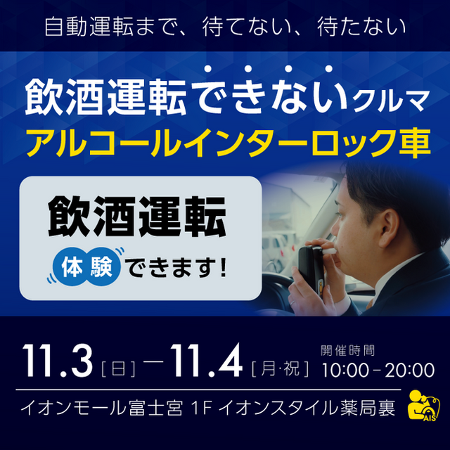 アルコール・インターロックの社会実装(違反者対策)のためのあらゆる活動と、アルコール問題を抱えた家族や親族を持つひとが、加害者家族にならない(被害者を生まない)ための予防活動を行う東海電子株式会社(本社:静岡県富士市 代表取締役 杉本 哲也)は、11月3日(日)11月4日(月・祝)にイオンモール富士宮にて、アルコール・インターロック搭載車の展示と飲酒運転・泥酔状態をご体験いただけるイベントを開催いたします。