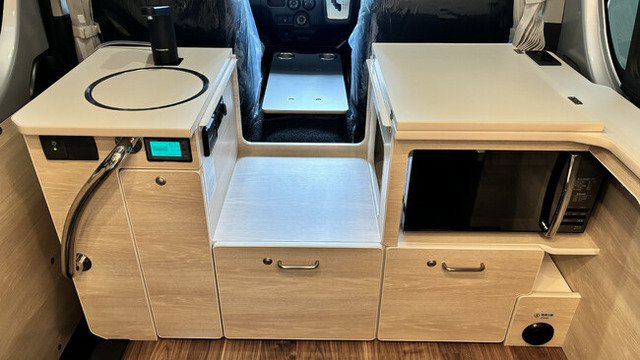 共通:ベースカー:TOYOTAハイエースバン特装車、5人乗車2人就寝、8ナンバー、サイズ:4695mm×1695mm×2370mm、冷蔵庫30L、清水・排水タンク各10L、蓋付シンク、ポータブルウォータータップ、カセットコンロ、テーブル、マックスファン、スカイライトルーフ、外部電源装置(標準バッテリー用)、薄型ソーラーパネル105W+コントローラー、サブバッテリーシステム、インバーター(1500W正弦波)、電子レンジ(ヘルツフリータイプ)、FFヒーター、シーリングボード(天井装飾)+LEDダウンライト(リモコンディマー付)、LEDランプ、LEDアンビエントライト、横向きシート(2点式シートベルト付)、プリーツカーテン、レースカーテン、断熱加工、バックドア木目トリム(LED付)