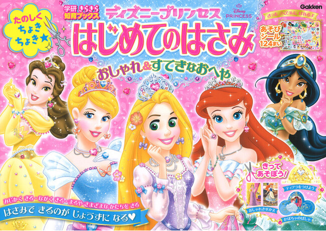ラプンツェル、アリエル、シンデレラ、ベル、ジャスミンをはじめ、人気のディズニープリンセスのおしゃれなドレスやきらきらのティアラ、すてきなお城など、かわいいアイテムを「はさみ」でたくさん切って遊んじゃおう!