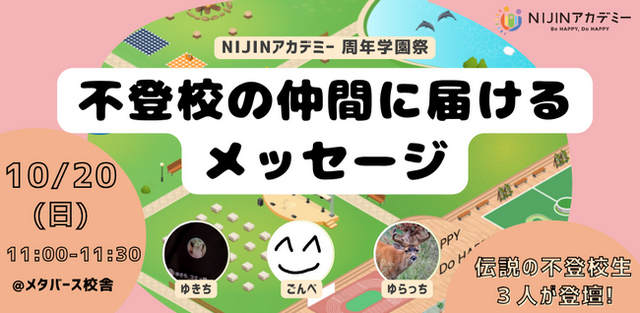 株式会社NIJIN(本社:東京都江東区、代表取締役:星野達郎)が運営する不登校オルタナティブスクール『NIJINアカデミー』は、10月19日(土)・20(日)に開催される「周年学園祭2024」で、当校に通う中学生3名による対談企画を行うことをお知らせいたします。