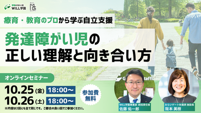 そこで今回、オンライン対談形式で、事例紹介を交えながら学研WILL学園・みらいゲートでの取り組みをご紹介、お家でのご家族の関わり方のアドバイスなどをさせていただくことになりました!