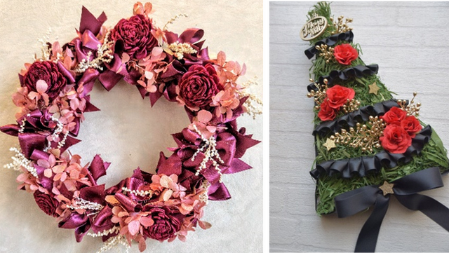 画像左:華やかにクリスマスを彩るリボンとプリザーブドのリース、画像右:リボン&フラワーアレンジクリスマスツリースワッグ