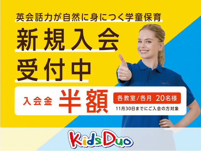 総合教育サービス事業の株式会社やる気スイッチグループ(東京・中央区、代表取締役社長:高橋 直司)が展開する英語で預かる学童保育「Kids Duo(R)(キッズデュオ)」は、11月30日(土)までに入会いただいた方を対象に入会金(通常23,100円・税込)が半額になるキャンペーンを実施しております。※
