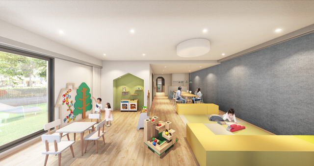 共用部には空の下でのびのび遊べる「キッズガーデン」、室内には多目的空間「コミュニティラウンジ」をご用意しており、いずれもボーネルンドが監修した共用施設を設置しています。