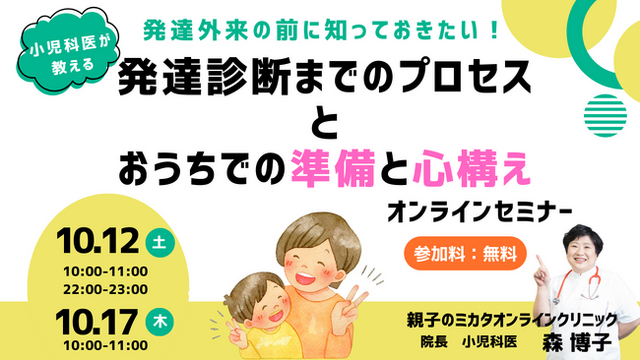 初めまして。親子の未来を創る発達診断「ママカルテ」主宰小児科医の森博子です。この度、『発達外来の前に知っておきたい!発達診断までのプロセスとおうちでの準備と心構え』オンラインセミナーを、10/12、10/17日にZOOMにて開催いたします。