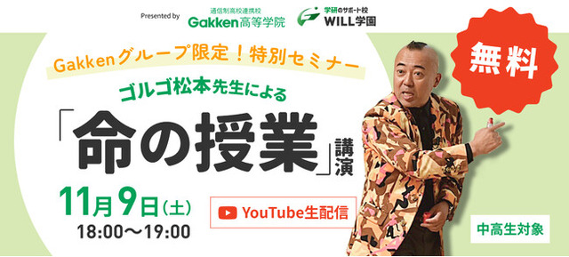 株式会社 学研ホールディングス(東京・品川/代表取締役社長:宮原博昭)のグループ会社、株式会社学研塾ホールディングス(東京・品川/代表取締役社長:勝野哲也)は、11月9日(土)に、中高生とその保護者を対象にしたゴルゴ松本氏の「命の授業」のオンライン講演会(無料)を開催いたします。