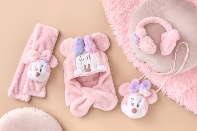 ラインナップは、これからの季節にぴったりな手袋をはじめ、マリーをイメージした耳とリボンが付いたイヤーマフなど、防寒対策はもちろん、ファッションのアクセントにぴったりな冬小物が勢揃い。中でも手袋は、マリーの肉球モチーフや、ミニーのドット柄リボンなどキャラクターらしさいっぱいのデザインがポイントです。また、マフラーやポシェットは、ぬいぐるみのようなボリューム感のあるキャラクターフェイスが特徴で、身に着けるだけでかわいく、おでかけがさらに楽しくなるアイテムです。そのほか、さまざまなシーンで使いやすいフード付きブランケットや、キャラクターの総柄が目を引く大判のブランケットも豊富に取り揃えました。