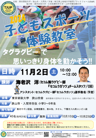 11月2日(土)、東京家政大学 狭山校舎で、狭山市・入間市在住の小学3年から6年生の子どもたちを対象に、タグラグビーの体験教室を開催します。一緒に汗を流しながら楽しく運動しませんか?参加は無料、初めての方も大歓迎です。