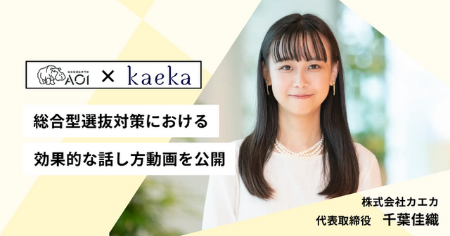 これまでAOI生やAOIの有料コンテンツのみでkaekaの話し方講座を提供して参りましたが、より多くの受験生に「話し方」を身につけてほしいという思いからYouTubeチャンネル「総合型選抜専門塾AOI」にて、株式会社カエカ代表取締役の千葉佳織氏とのコラボ動画を配信いたします。