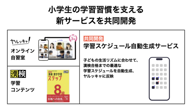 子どもの生活リズムに最適化された、漢検合格までの学習スケジュールを自動生成する新サービスを共同開発します。このスケジュールは「ヤルッキャ」に自動的に反映され、その後はスムーズに学習を進めることが可能です。