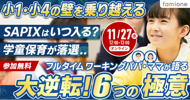 「子どもを願うすべての人によりそい 幸せな人生を歩める社会をつくる」をビジョンに掲げ、法人の従業員向け福利厚生や自治体の住民向け支援を行うヘルスケアサポートサービス「ファミワン」 https://famione.com/benefit/ などを展開する株式会社ファミワン(本社:東京都渋谷区、代表取締役:石川勇介)は、11月27日に動画コンテンツ「ファミワンラーニング」にてオンラインセミナー「小1・小4の壁を乗り越える フルタイムワーキングパパ・ママが語る 大逆転!6つの極意」を開催します。
