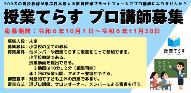 株式会社NIJIN(本社:東京都江東区、代表取締役:星野達郎)が運営する教員研修プラットフォーム『授業てらす』は、全国の教員を対象に『授業てらすプロ講師』を募集いたします。