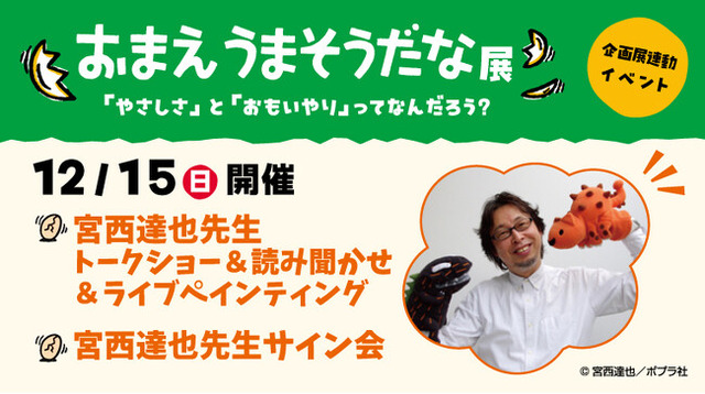 絵本『おまえうまそうだな』(ティラノサウルスシリーズ)は、「親子の愛」「友情」などさまざまな「愛」の形を描いた、宮西達也によるロングセラー作品です。シリーズは16冊に及び、2003年の発売から、昨年20周年を迎えました。乱暴者に見えるティラノサウルスに芽生える優しい気持ちは、子どもから大人まで幅広い世代に感動を呼び、日本だけでなく国境を超えて世界中で愛されています。本展ではそんな恐竜たちの世界をまるごと紹介する展覧会です。絵本の世界に飛び込んでぜひお楽しみください。