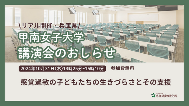 感覚過敏研究所を運営する株式会社クリスタルロード(本社:東京都中央区、代表:加藤路瑛)代表取締役の加藤路瑛は、2024年10月31日(木)に甲南女子大学 人間科学部 第128回「子ども学」講演会にて、「感覚過敏の子どもたちの生きづらさ」をテーマに講演します。