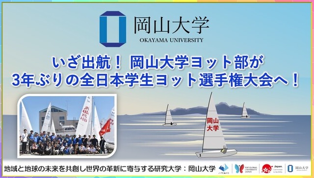 岡山大学ヨット部は、10月30日に江の島ヨットハーバー(神奈川県)で開催される全日本学生ヨット選手権大会のスナイプクラスに出場します。3年ぶりの全国大会に挑む同部の活躍にご期待ください。
