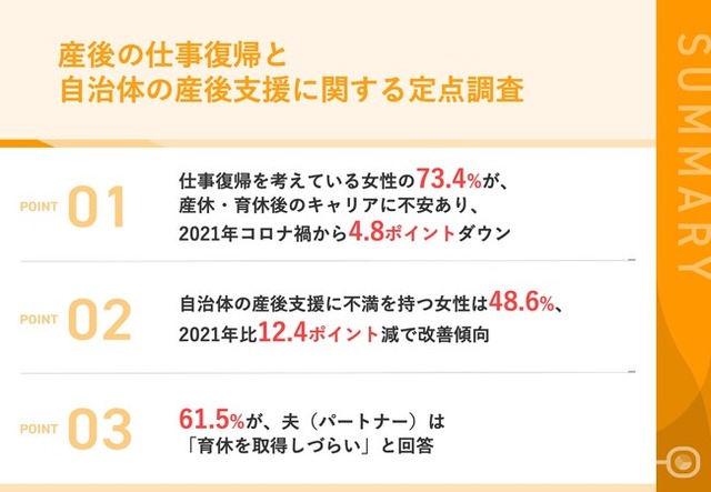 まず、仕事復帰を考えている女性の73.4%が、産休・育休後のキャリアに「不安を感じる」と回答しており、2021年から4.8ポイントの減少となりました。その理由としては、第1位「子育てと仕事の両立ができるか心配」(82.5%)、第2位「収入面で不安」(68.8%)の結果が出ています。また、自治体の産後支援に不満を感じる女性は48.6%で、2021年比12.4ポイント減と改善傾向ですが、「ブランクがあり、子どもがいる人への就職活動のサポート」や「病児保育の場所が少ない、希望の保育園に入れない」などの支援を求める声が挙がりました。さらに、仕事復帰に関しては、2021年に続き、半数以上が「できるだけ早期に仕事復帰したい」と希望しています。最後に、夫(パートナー)の育休取得の実態について尋ねたところ、育休取得経験がある人は35.8%に留まり、61.5%が、「男性が育休を取得しづらい環境である」と回答しました。