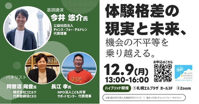 また、北海道NPOファンドは「地方における学習・能力向上機会の拡充による選択格差の解消」という助成事業により、地方における体験格差解消アイディアを募集、3団体を採択しこのテーマに取り組んでいます。本講演会は、体験格差の要因を明らかにし、北海道で活躍する実践者とともに、こどもたちの未来のために何をするべきなのかを考えます。