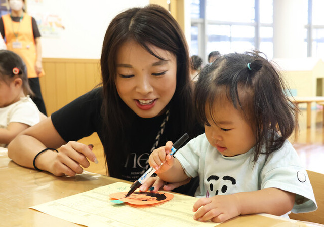 同センターは、平成19年に開館。0歳から就学前の乳幼児とその保護者を支援する施設で、親子で楽しめる講座や料理教室などを定期的に開催しています。この日は、ハロウィーンバッグを制作する「工作の日」を開催。子どもたちは、かぼちゃの形をした画用紙に目や鼻を自由に描き、ジャック・オー・ランタンを制作。その後、事前に用意されていた紙皿で作ったバッグの土台にジャック・オー・ランタンを貼り付け、カラーペンやシールを使って装飾し、世界に1つだけのオリジナルバッグを完成させました。