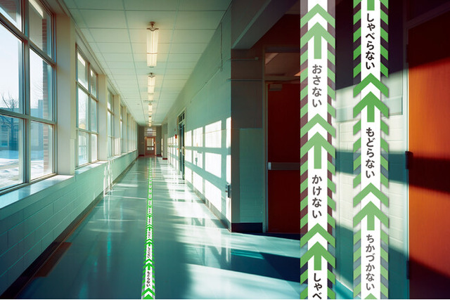 避難訓練のために廊下に貼られた「はるるーと」