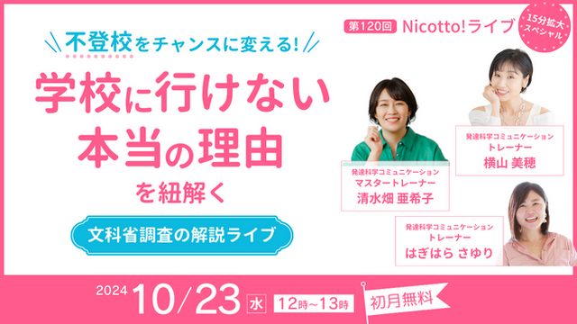 (株)パステルコミュニケーション(本社:東京都豊島区、代表取締役:吉野加容子)が運営する、発達障害・グレーゾーンの子どもを育てるママがいつでも学べて相談できる月額制会員サイトNicotto!塾は、10月23日(水)12時から「\不登校をチャンスに変える!/学校に行けない本当の理由を紐解く~文科省調査の解説ライブ~」オンラインライブを開催いたします。https://desc-lab.com/nicotto2022/?prt1018
