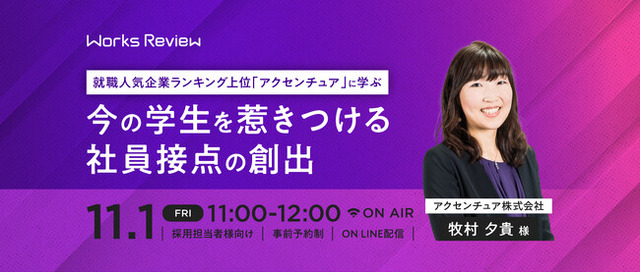 株式会社ワークス・ジャパン(本社:東京都千代田区、代表取締役:清水信一郎)は、2024年11月1日(金)に採用・人材開発業務に携わるご担当者様、大学キャリアセンターにお勤めの方を対象にしたオンラインフォーラム『就職人気企業ランキング上位「アクセンチュア」に学ぶ 今の学生を惹きつける社員接点の創出』を開催します。