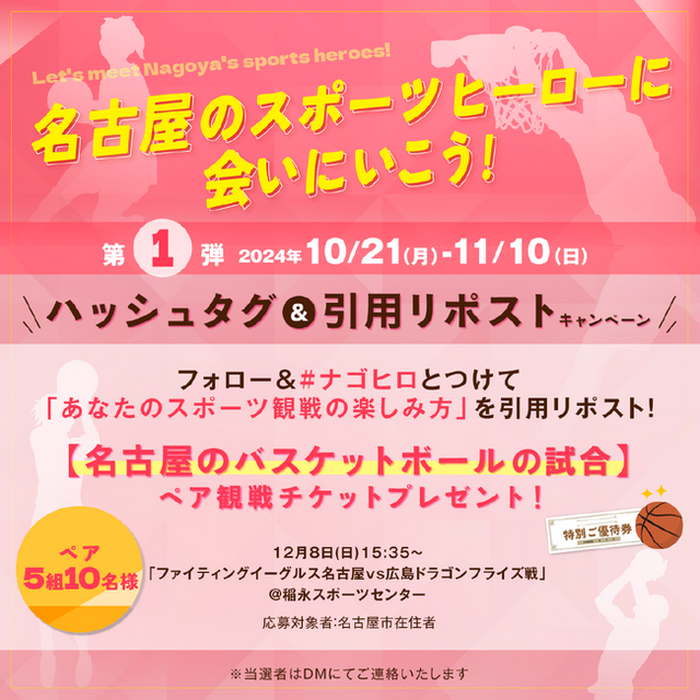 キャンペーン公式X「ナゴヒロ【名古屋のスポーツヒーローに会いにいこう】」(@nagohero_sports)をフォロー、キャンペーン投稿に「#ナゴヒロ」をつけて、引用リポストして名古屋のスポーツを盛り上げよう!あなたの“スポーツ観戦”への想いをどんどん投稿してください。