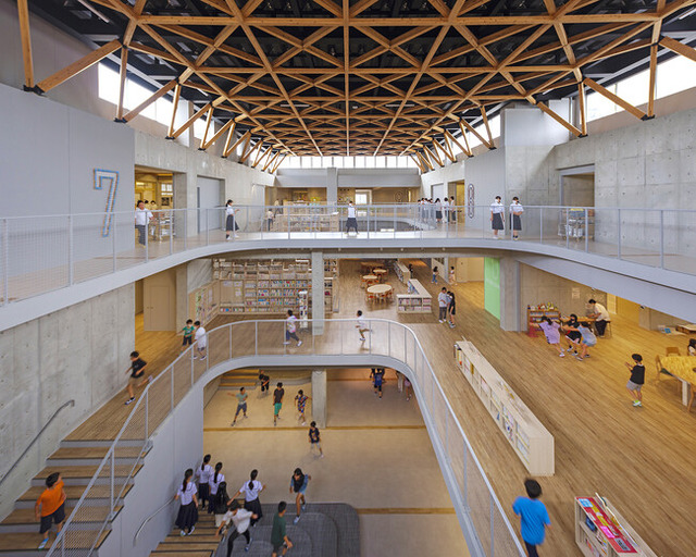義務教育学校とは、小学校から中学校までの義務教育を一人の校長と一つの教職員組織で一貫して行う、小中一貫校よりも柔軟な運用が可能な新たな学校のカタチで、2016年から制度化されたものです。今回のプロジェクトは、嘉麻市が新たに整備した3つの義務教育学校の1校となります。計画にあたっては、非常に短い工期で設計と工事を行うために、設計者と施工者がタッグを組み、設計から工事までを一貫して行う「デザインビルド」という方式で発注されました。市の目指す学校像はもちろんのこと、設計期間中に文部科学省より公表された「新しい時代の学びを実現する学校施設の在り方について」という報告書を受け、発注者・設計者・施工者そして学校が一体となって、子どもたちが一日の大半を過ごすことになる新たな環境の在り方について深く議論し、稲築東義務教育学校を実現しました。最も大きな特徴は、学校の中心に「メディアコモンズ」という吹抜け空間をもつ図書スペースであり、通路であり、発表の場であり、学習の場としても機能する共用部をつくったことです。