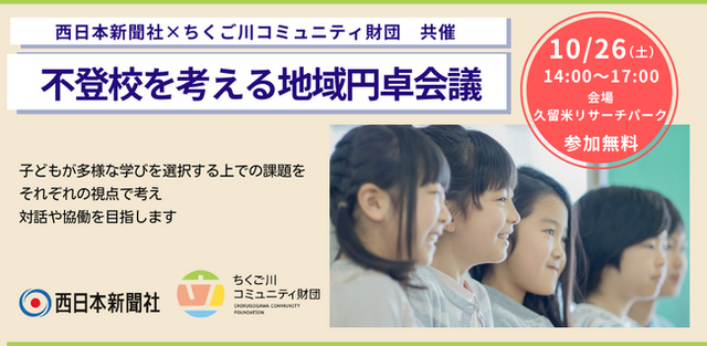 一般財団法人ちくご川コミュニティ財団(所在地:福岡県久留米市梅満町、代表理事:宮原信孝、以下「ちくご川コミュニティ財団」)は、不登校の子どもたちが置かれている状況や課題について市民が集まって考える「不登校を考える地域円卓会議」を、株式会社西日本新聞社(本社:福岡県福岡市中央区、代表取締役社長:田川大介、以下「西日本新聞社」)と共催いたします。