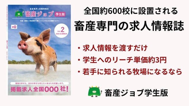 畜産業界の就職情報誌です。畜産業界従事者のための就職求人情報が詰まったフリーペーパーで、全国600校以上の畜産関連教育機関(高校・専門学校・大学)にて配布されます。