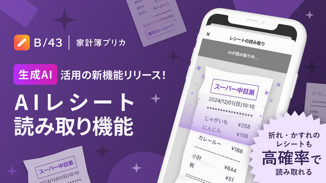 家計簿プリカ「B/43(ビーヨンサン)」を提供する株式会社スマートバンク(本社:東京都品川区、代表取締役:堀井 翔太、以下「スマートバンク」)は、「B/43」アプリにおいて、生成AIを活用することで、どんなレシートでもパシャっと撮ってすぐ支出記録ができる「AIレシート読み取り機能」の提供を開始いたします。