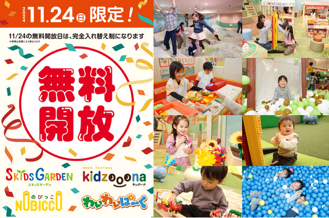 株式会社イオンファンタジー(本社:千葉県千葉市、代表取締役社長:藤原徳也、以下、当社)は、「世界こどもの日」(11月20日)に合わせて、遊びを通じてこどもたちの健やかな成長を願い、当社が運営するプレイグラウンドの「スキッズガーデン」「キッズーナ」「のびっこ」「わいわいぱーく」 等全国200カ所以上において、「世界こどもの日」直近の日曜日の11月24日(日)に施設の無料開放を実施いたします。