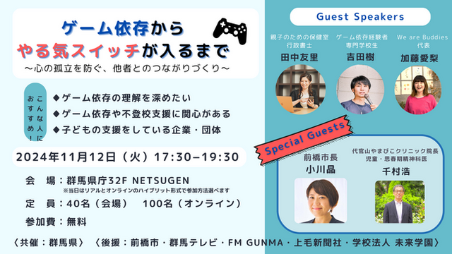 一般社団法人 We are Buddies (本社:東京都渋谷区 代表:加藤愛梨)は、子どもの心の孤立を防ぐことを目的とし、子ども(5~18歳)と大人ボランティアが二人組のバディ(buddy = 相棒、仲間、友人)になり信頼関係を築くプログラムを運営しています。心の孤立の予防に関する啓蒙活動も行う中で、今回はゲーム依存をテーマに、活動エリアの一つである前橋市にてイベントを開催いたします。