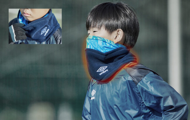 『アンブロ』の「ガード付き2WAYネックウォーマー」は、本体には温かいフリース素材、上部にはストレッチ素材を使用したハイブリッド構造が特徴です。上部のストレッチ素材が首にフィットしやすいので隙間ができにくく、上まで引っ張り上げれば鼻や口元までガードすることができます。サッカーの練習が始まるまでは鼻や口元まで覆ってしっかり防寒し、動き始めたら首まで下げたり、ストレッチ素材部分を内側に折り込んで着用するなどシーンに合わせた着用方法が可能です。