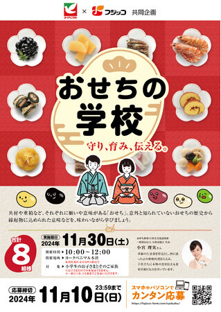 フジッコ株式会社(本社:神戸市中央区/代表取締役社長執行役員:福井正一)は、株式会社ヨークベニマル(本社:福島県郡山市/代表取締役社長:大高耕一路)と協同で、2024年11月30日(土)に親子等8組様をご招待し、ヨークベニマル本社テストキッチンにて、日本のおせち文化を「守り、育み、伝える。」ことを目的とした「おせちの学校」を開催いたします。