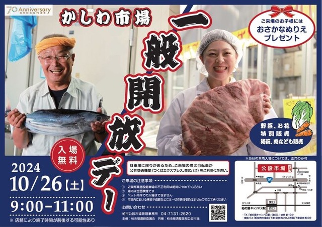 当日は、水産仲卸店舗での新鮮な魚や柏市産の野菜、花の販売を行います。また、肉や海苔、調味料なども販売されます。