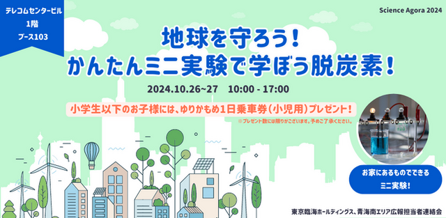 臨海副都心青海地区では、脱炭素化に向けた取組を推進するため、発電過程で有害物質を排出しないグリーン水素を活用した事業に取り組んでいます。このたび、株式会社東京臨海ホールディングスは、サイエンスアゴラ2024にブースを出展します。出展ブースでは水素を利用した発電の仕組みを学べるミニ実験を通じて、来場者の皆様に新しいエネルギーの可能性を体感していただく機会を提供します。