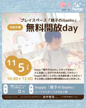 特定非営利活動法人ほっぺ(代表:大森奈津子・兵庫県三木市)は、2024年11月5日(火)、乳幼児親子のプレイスペースhoppe「親子のibasho」(コーベヤスポーツ三木店3階)を『無料開放day』とします。hoppe「親子のibasho」に行ってみたい!どんな過ごし方ができるのか試してみたい!hoppeに来たことがないお友達を誘ってみたい!そんな時におすすめできるのが『無料開放day』です。