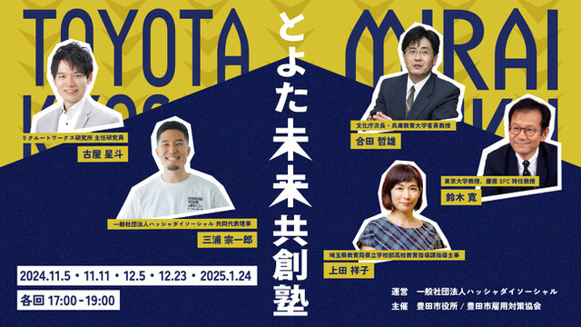 「Choose Your Life!それでもなお、人生は選べる。」をスローガンに掲げる一般社団法人HASSYADAI social(本社:東京都港区、代表理事:勝山恵一 三浦宗一郎、以下ハッシャダイソーシャル)は愛知県豊田市・豊田市雇用対策協会と共同で、豊田市内の企業・教員・若者が集い地域社会の雇用や働き方の未来をともに考える「とよた未来共創塾」を2024年11月より実施いたします。